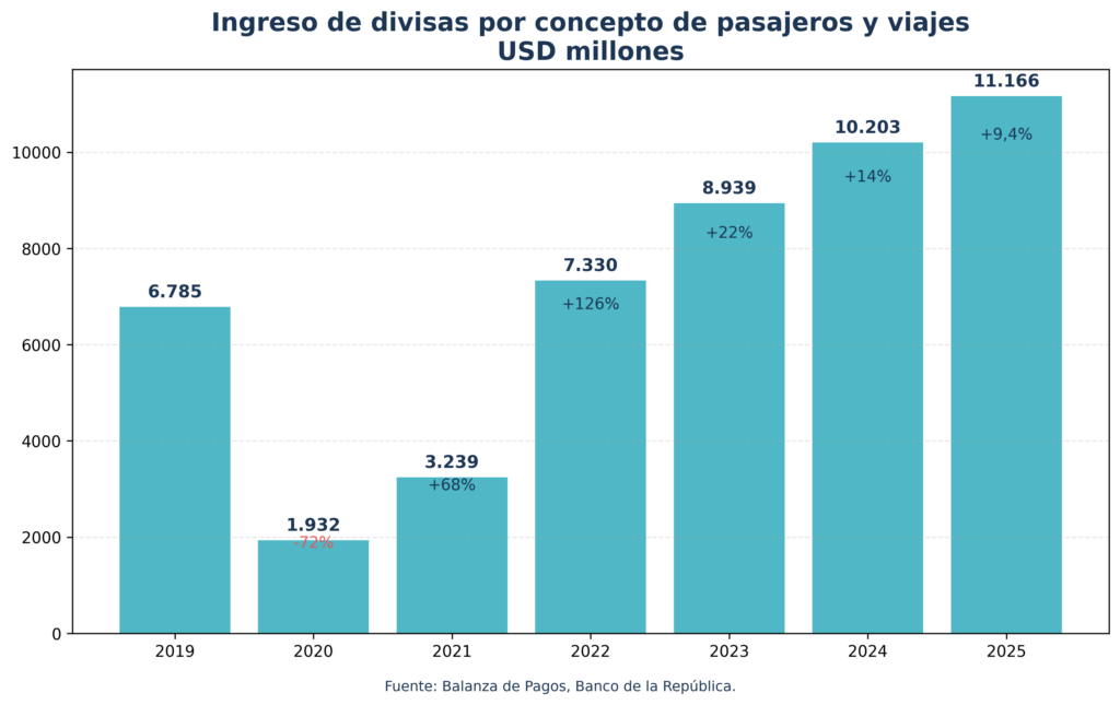 Según ProColombia, este resultado muestra un crecimiento del 9,4 % en comparación con el año 2024, cuando se reportaron ingresos de US$10.203 millones. Este rendimiento tiene una relación directa con el incremento en la llegada de turistas.
